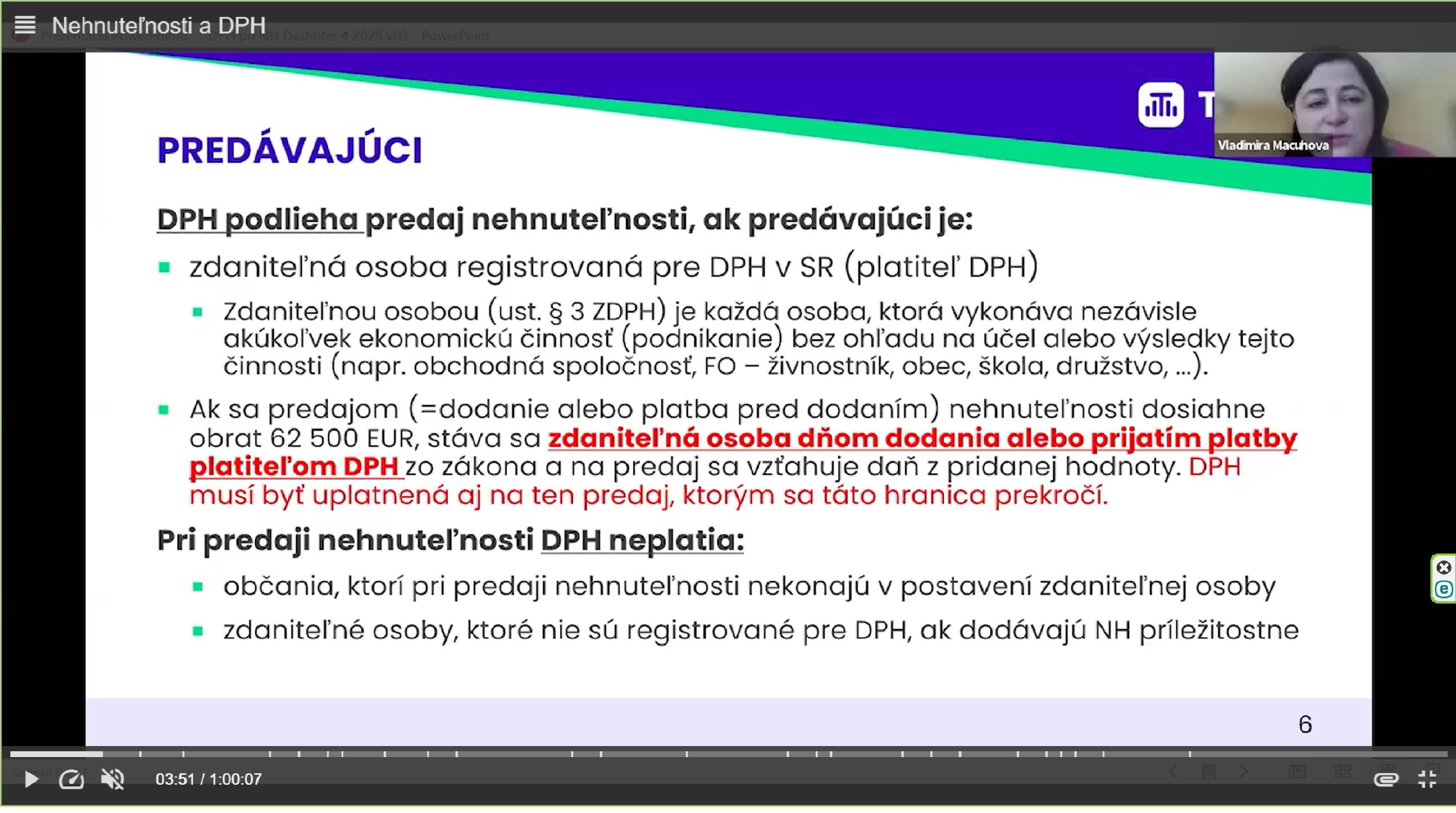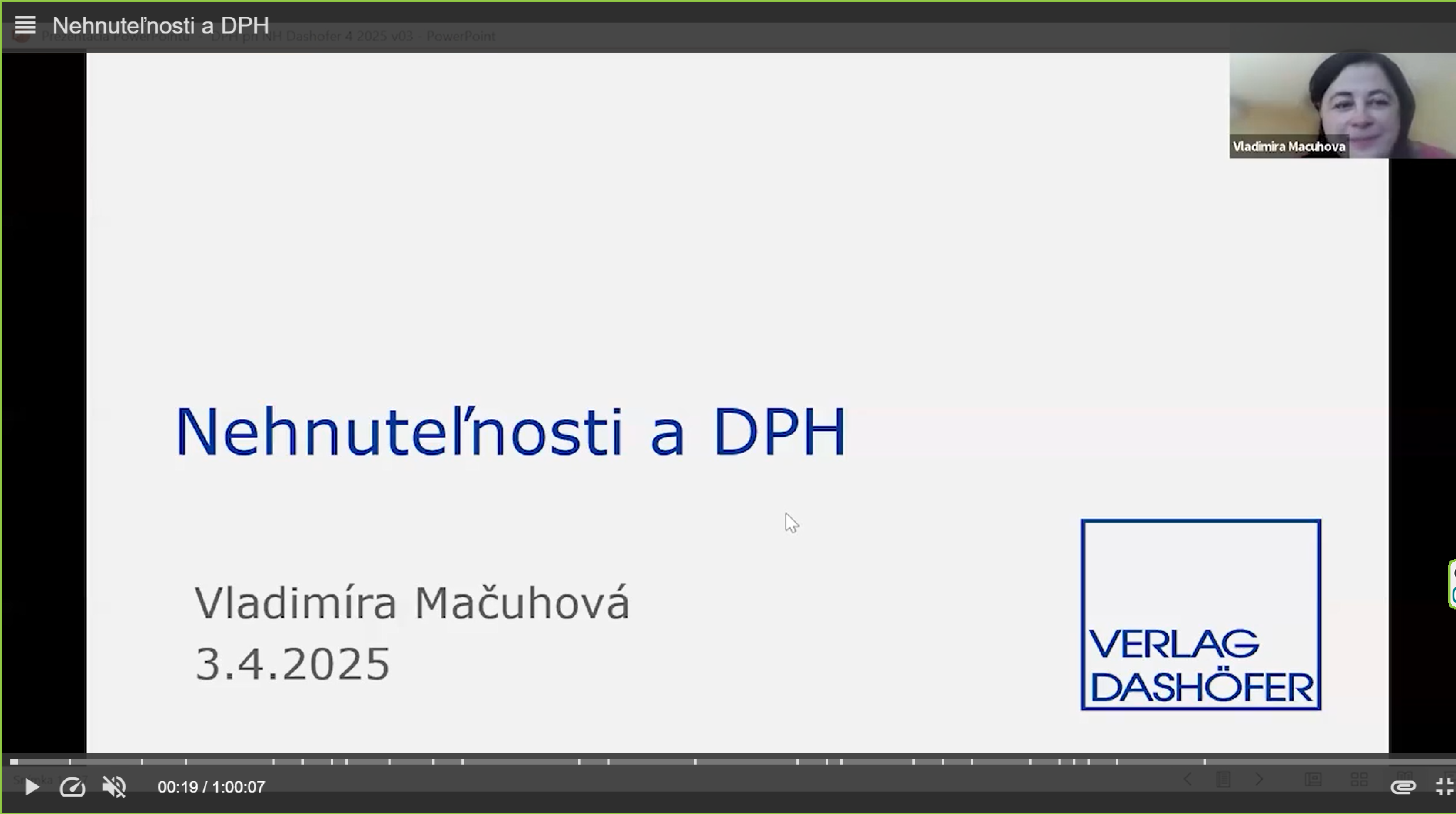 Mala som webinár na tému „Nehnuteľnosti a DPH v roku 2025“, ktorý som viedla 3. apríla 2025 pod záštitou Verlag Dashöfer. Tento webinár bol určený všetkým, ktorí sa v praxi stretávajú s DPH v súvislosti s predajom, prenájmom alebo výstavbou nehnuteľností – či už ide o účtovníkov, podnikateľov, správcov nehnuteľností alebo právnikov.